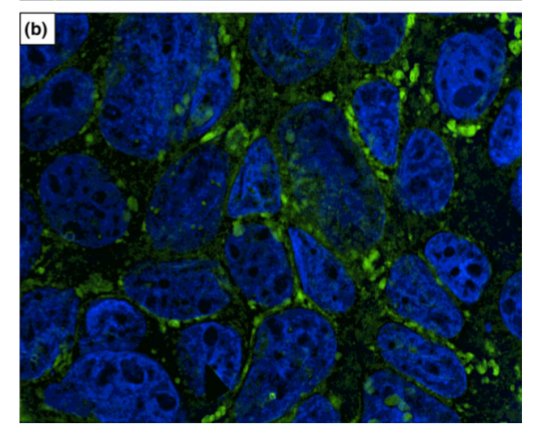 De esta manera, la alternativa de incorporar los extractos en una partícula muy pequeña hace posible que éstos resistan a la degradación gastrointestinal y puedan llegar a su sitio de acción biológica. Mediante los experimentos realizados para este estudio, se demuestra que la nanoencapsulación mejora la capacidad de los extractos de atravesar una barrera formada por células intestinales, lo cual permitiría aumentar los beneficios cardiovasculares del consumo de éste y otros extractos con potencial biomédico. En la imagen inferior se puede apreciar como las nanopartículas, conteniendo una molécula fluorescente verde, ingresan a la célula, lo cual podría ser indicativo de que son capaces de atravesar este barrera y llegar hasta los vasos sanguíneos.